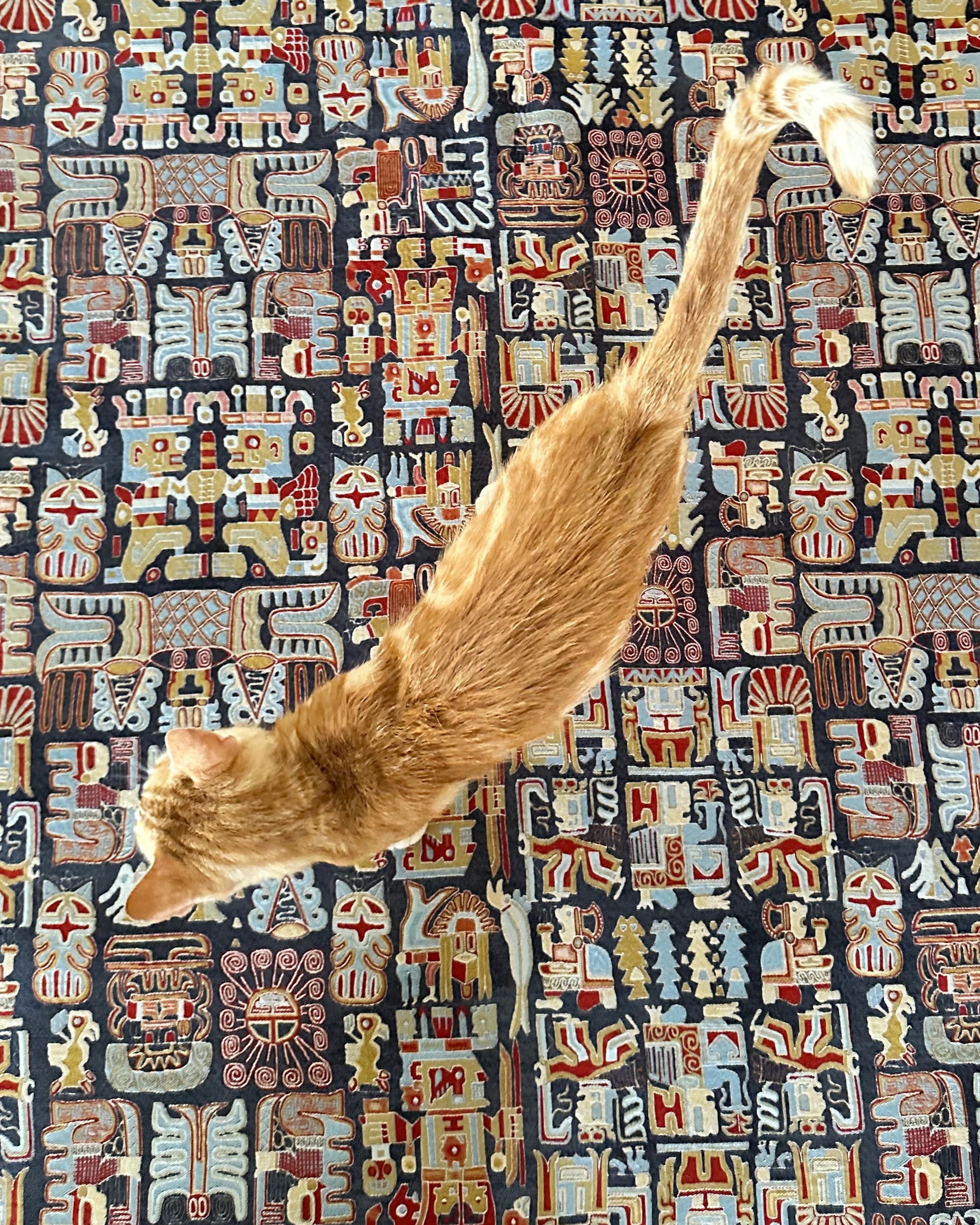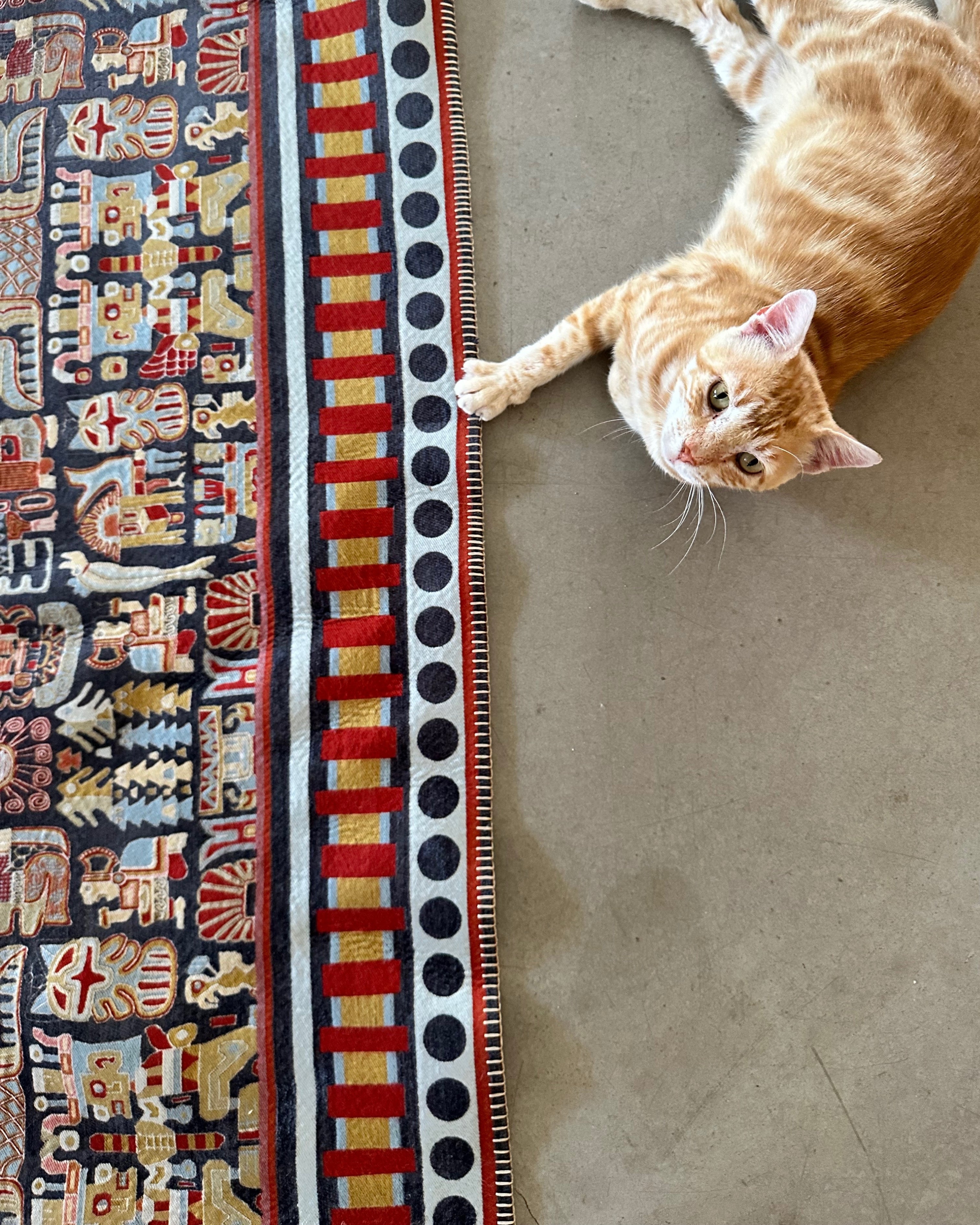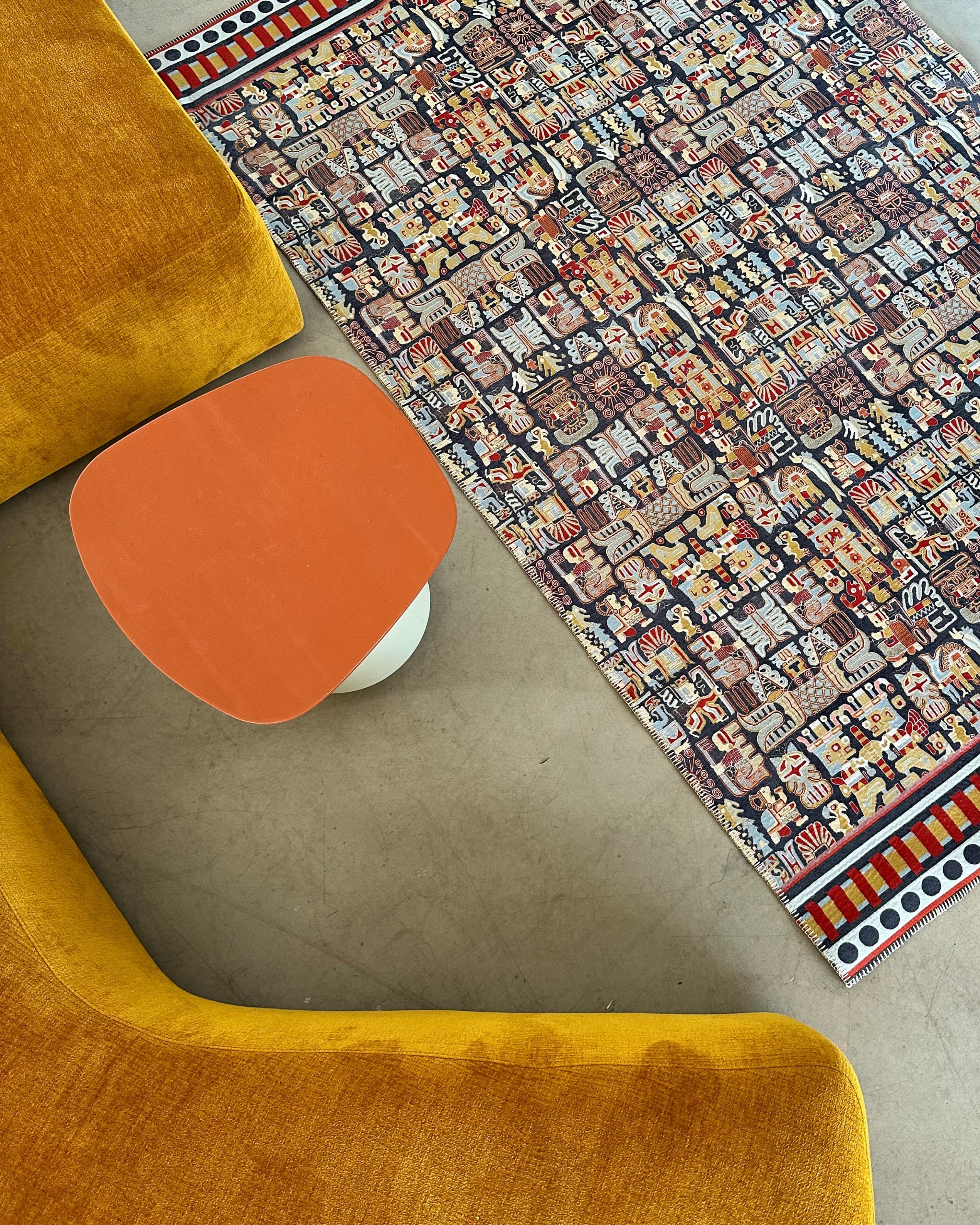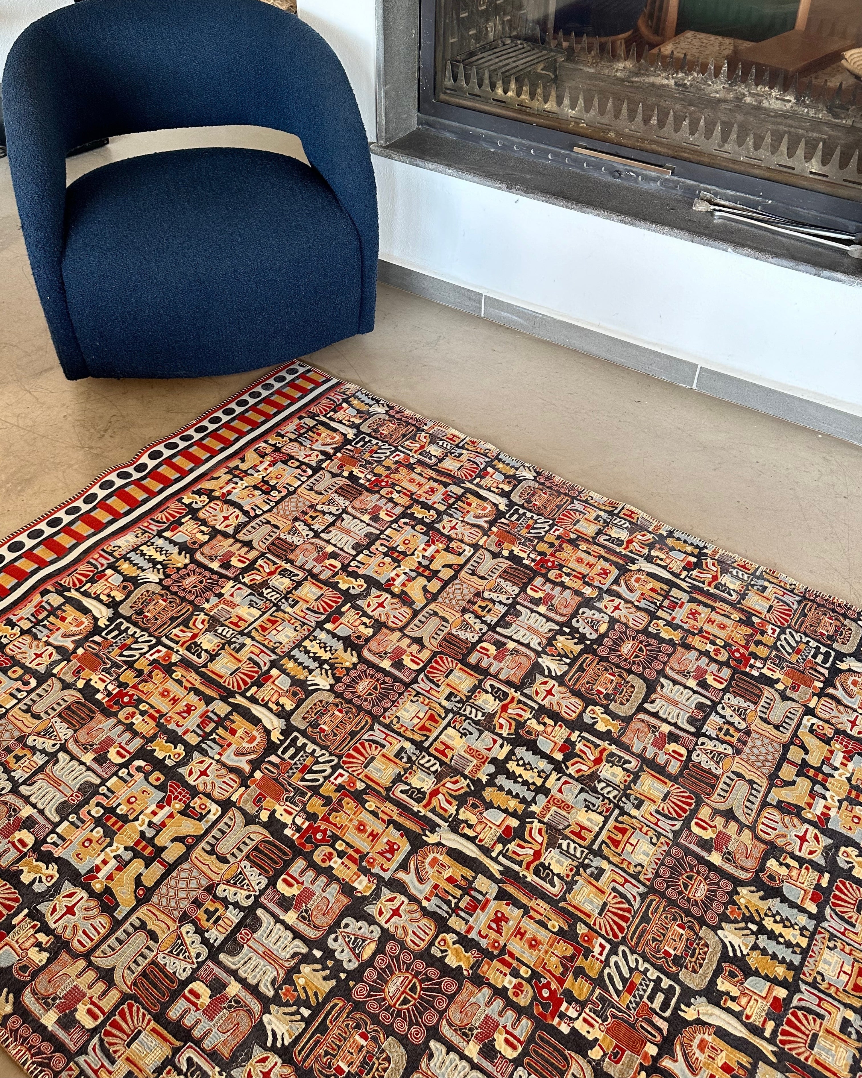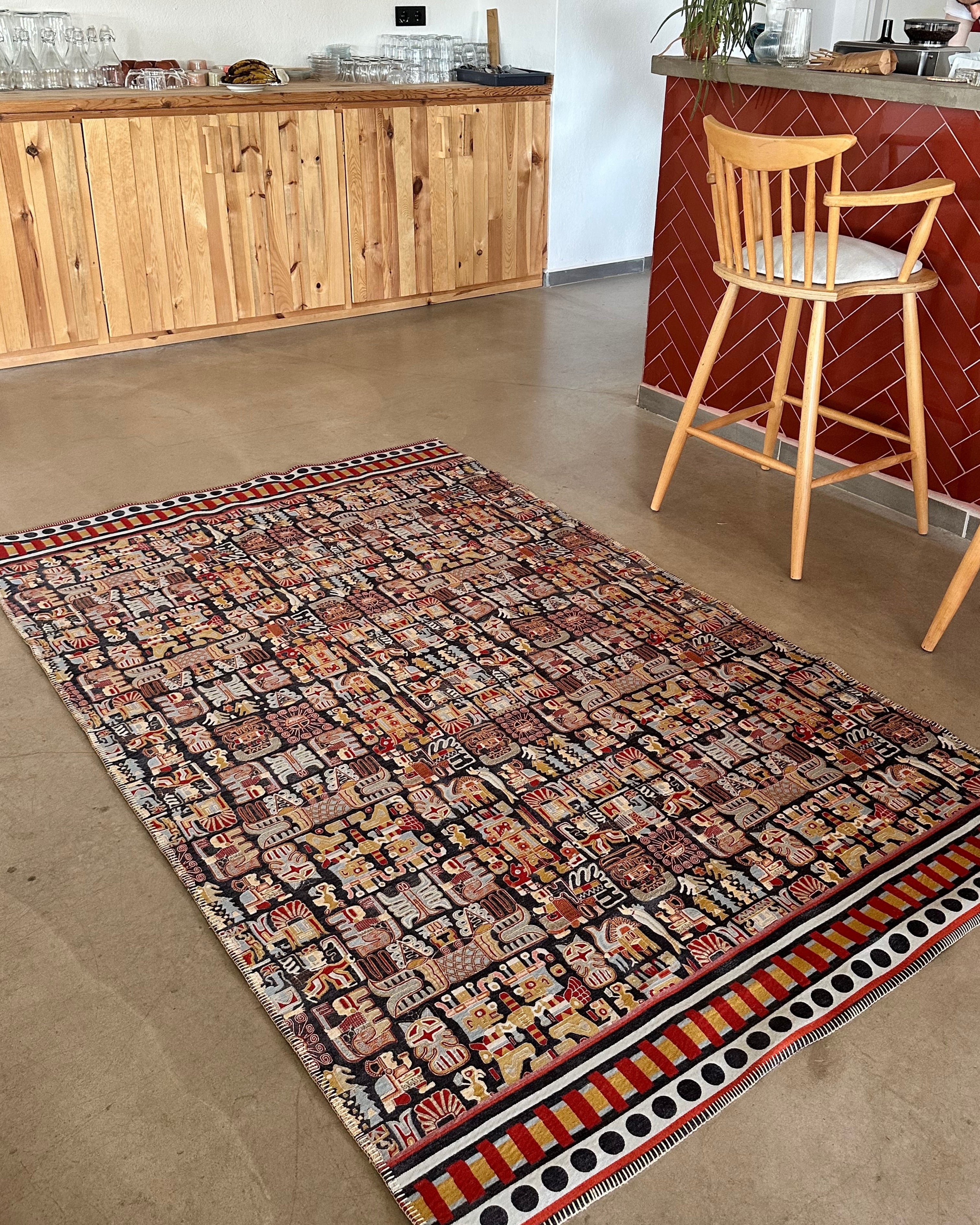 This rug is inspired by the Wari civilization, ancient Peru's first great empire, which thrived between 600 and 1000 AD. The Wari society is renowned for its sophisticated textile arts. The patterns on this rug are a modern interpretation of the geometric shapes and stylized human and animal figures commonly found on Wari tunics. Staff-bearing figures symbolize leadership and spiritual authority, while bird and feline motifs represent strength and agility. This design not only adds aesthetic value to your home but also carries the legacy of a culture that spans thousands of years.