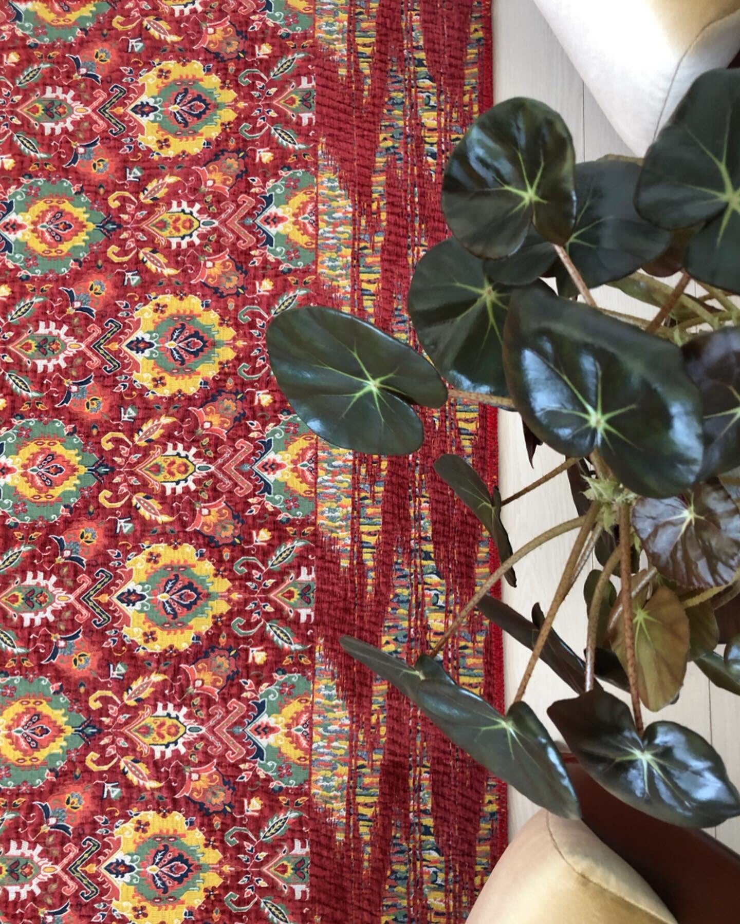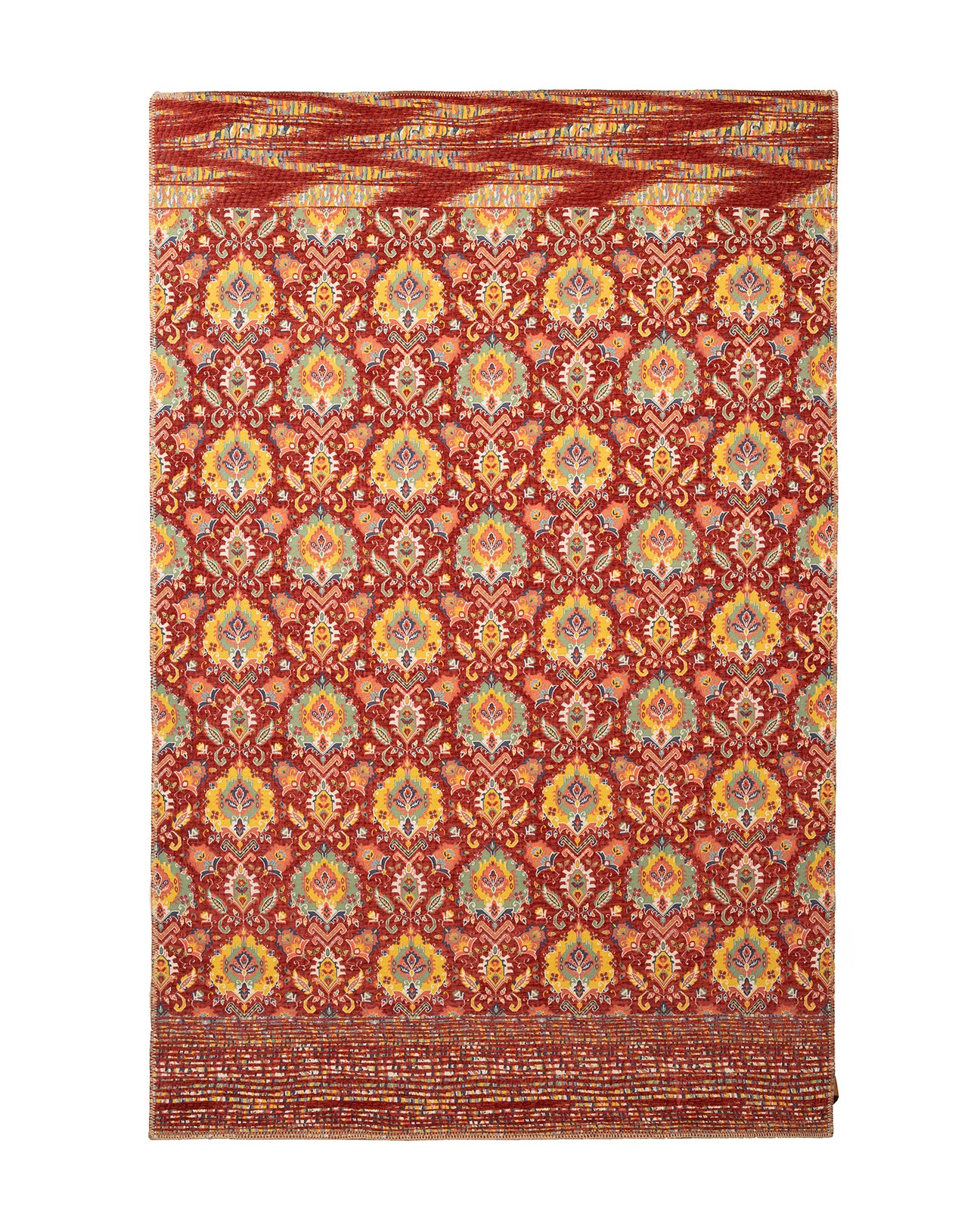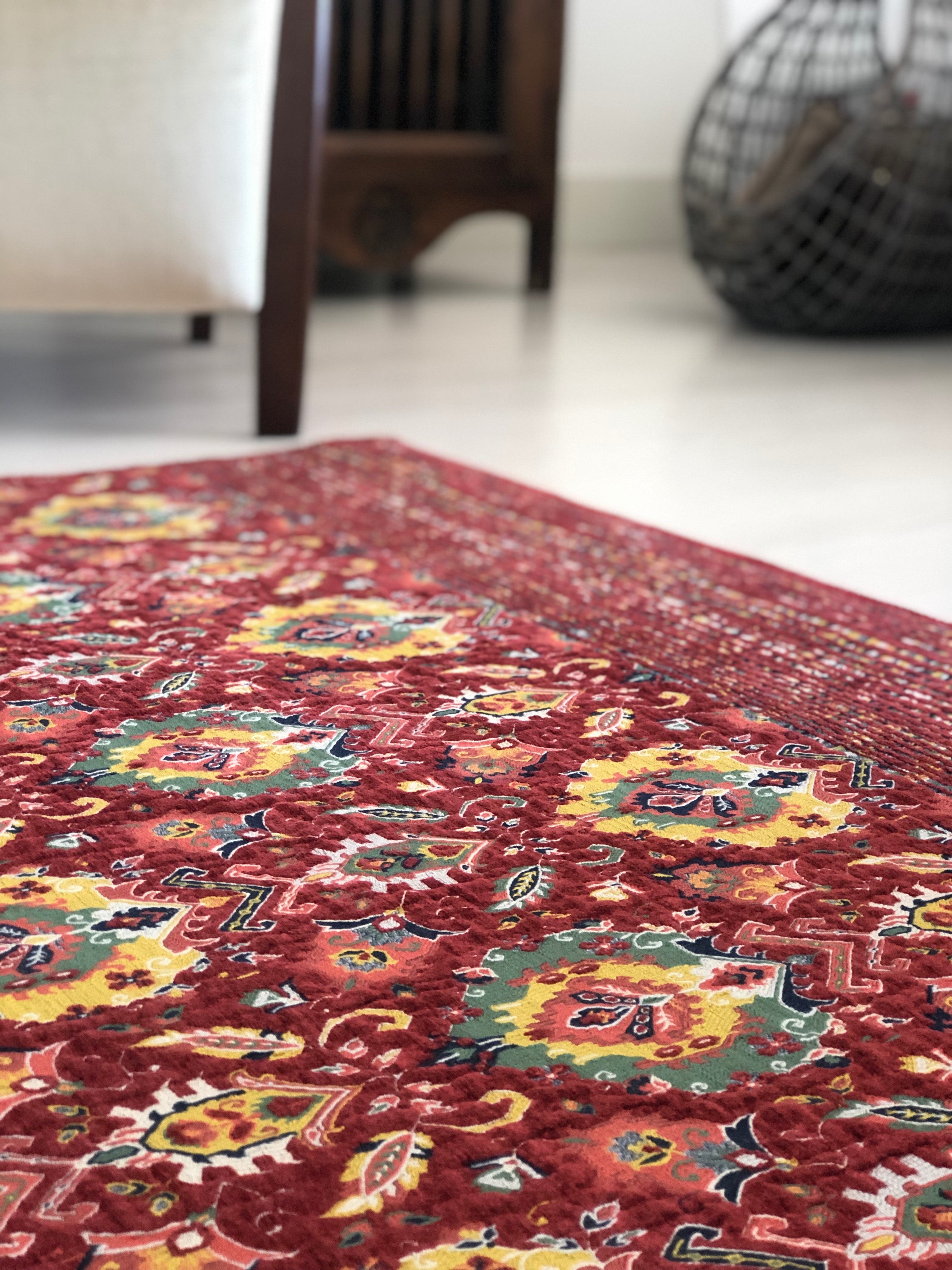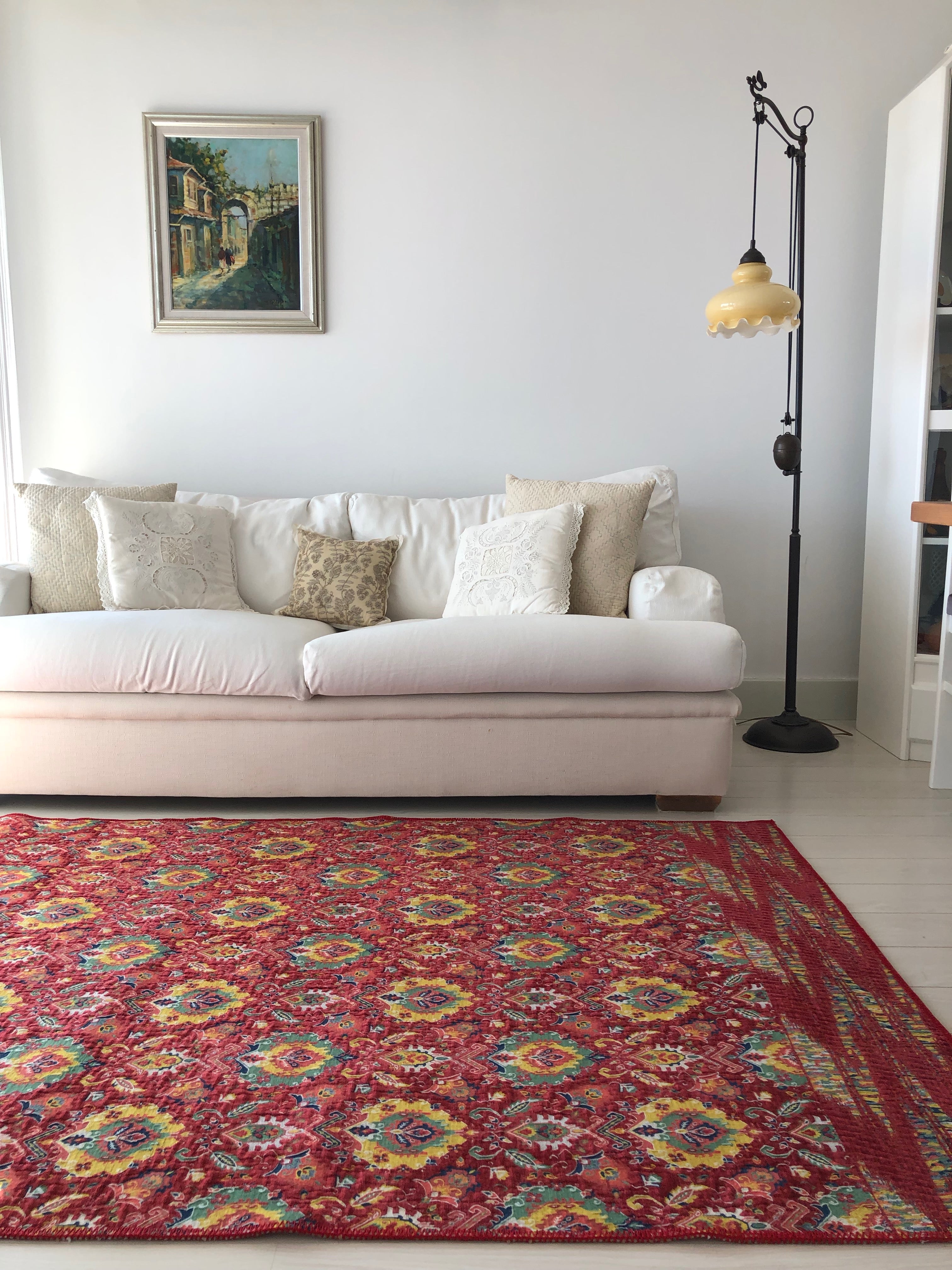 Geleneksel olarak Suzani, başta Özbekistan, Kazakistan ve İran olmak üzere Orta Asya ülkelerinde yapılan işlemeli bir kabile tekstili türüdür. Suzani terimi, iğne anlamına gelen Farsça suzan kelimesinden türemiştir. Bu muhteşem dokumalar, güneş ve ay disklerini, çiçekleri, asmaları, meyveleri (özellikle narları) ve bazen de kuşları ve balıkları temsil eden akıcı eğri motiflerle özenle işlenmiştir. Klasik desenler ve motifler olmasına rağmen, her bir suzani tekstili benzersizdir ve kendine özgü hikayesini anlatır. İsmini Özbekistan'nın başkenti Bukhara'dan alan Feyz Bukhara Suzani halılarımızla orijinal Suzani tasarımları uyarlanmıştır. Bordurlerinde ise geleneksel bir tasarım olan suzani desen yerine kontrast çeşitlilikler ile harmanlayarak dengeli bir görsel dil kullanarak kendi içinde bütüncül ama oldukça aykırı, özgün ve yenilikçi bir dekorasyon anlayışı katarak tasarlanmıştır.